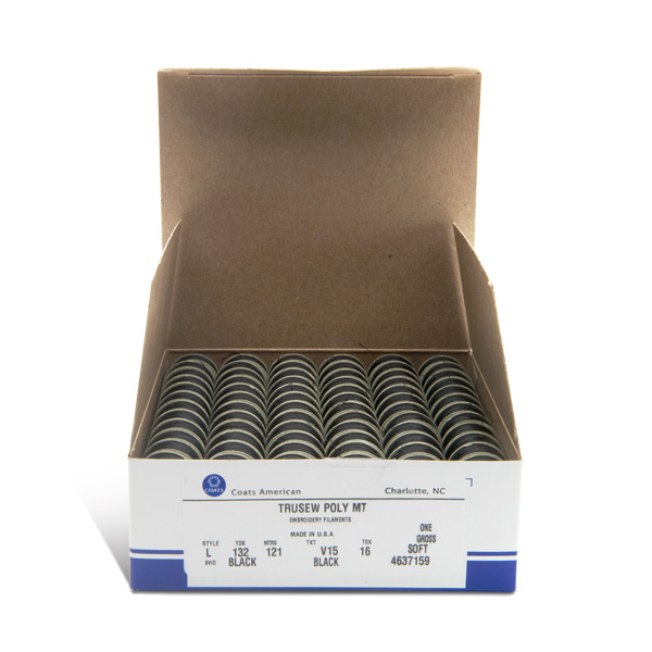 Coats American V15 100% continuous filament, Trusew polyester thread is thin and very durable. This is a pre-wound black "L" style bobbin that fits most commercial embroidery machines.